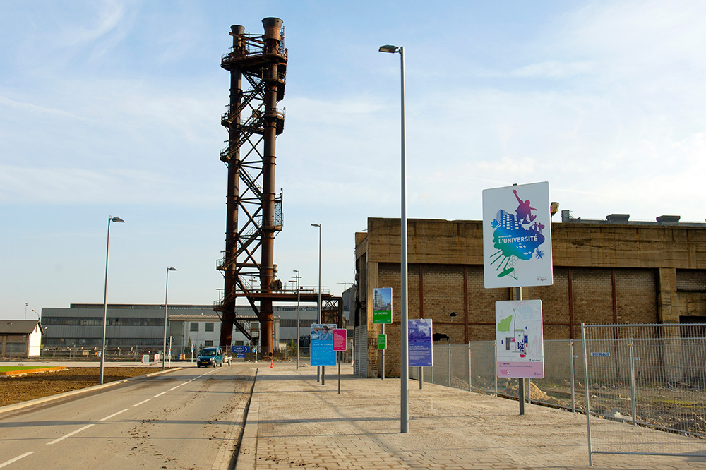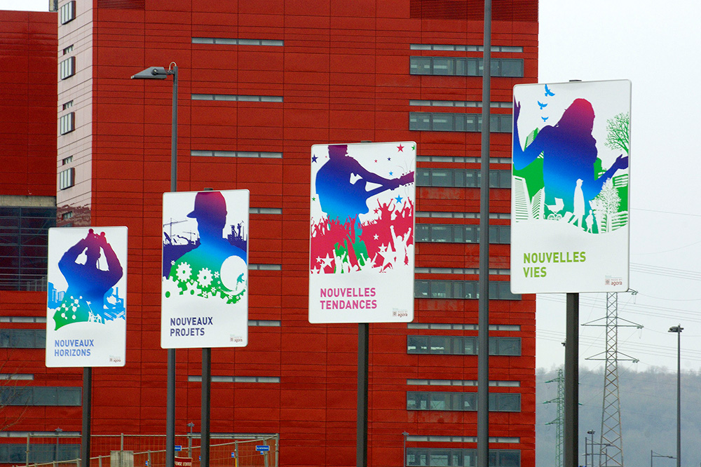 Le “concept d’utilisation intermédiaire” (ZNK) est un projet combinant communication de projet, identité de site, recherche culturelle, rédaction, édition et suivi de la mise en œuvre. Agora est la société d’aménagement chargée de développer le site de Belval, une ancienne usine sidérurgique localisée à la frontière du Luxembourg et de la France, le plus grand projet de restructuration d’une friche industrielle dans l’histoire du Grand-Duché. Le projet urbain s’appuie notamment sur la relocalisation et le développement de l’Université du Luxembourg à travers le concept de la Cité des Sciences. Depuis 2005, Agora a confié à Polaris Architects la mission de concevoir et de réaliser un ZNK pour le site de Belval. Le projet est passé par plusieurs étapes et le concept a dû s’adapter à l’évolution du chantier et à la présence de différentes catégories d’usagers. En 2011, l’identité visuelle développée par Polaris Architects spécialement pour la communication in situ du ZNK, a été étendue à l’ensemble des supports de communication de Belval: web, papier, publicité, événements. L’identité graphique du ZNK a été développée pour se déployer in situ, en grand format, dans le cadre d’une opération d’accueil et d’information des premiers visiteurs et occupants du site de Belval en cours d’aménagement. Un grand linéaire coloré marquant l’entrée principale du site et une série de sept stations d’information avaient été implantés dès la rentrée 2006.