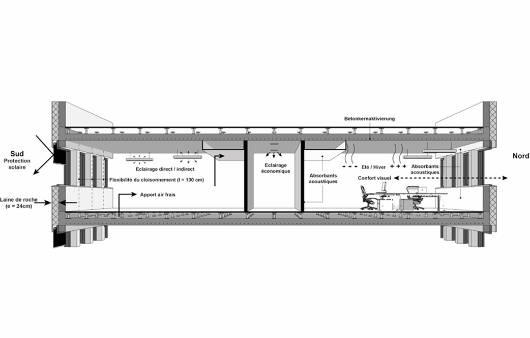 L’immeuble Horizon, premier Nearly Zero Energy Building au Luxembourg, combine un souci d’efficience architecturale et des performances énergétiques de pointe. Il est doté en toiture d’une surface de 900 m² de cellules photovoltaïques couvrant la plus grande partie des besoins en énergies du bâtiment. Des études approfondies ont permis d’optimiser les installations techniques de l’immeuble : outre une isolation renforcée et une protection extérieure des fenêtres contre le rayonnement solaire, il est doté d’un système d’activation des dalles de béton, assurant tant le chauffage que le refroidissement, ainsi que d’un système de ventilation avec une centrale de récupération de chaleur, permettant d’augmenter le confort tout en réduisant les charges énergétiques. L’immeuble se trouve à 2 km de la ville de Luxembourg et est branché sur les lignes de transport en commun et les équipements de mobilité douce de la capitale (Vel’oh!). Il est aussi accessible par voiture et dispose d’un vaste parking souterrain. L’entrée de l’immeuble se fait par la rue du Kiem, une rue calme parallèle à la Route d’Arlon. Le projet anticipe les futures voies destinées à améliorer la desserte vers l’autoroute. Conçu pour bénéficier des apports de lumière naturelle tout au long de la journée, le plan de l’immeuble se veut simple, flexible et diversifié. Du plateau paysage aux bureaux individuels, une multitude de possibilités d’aménagement sont offertes de façon à satisfaire une large palette de façons de travailler. Afin d’augmenter encore la flexibilité et la qualité finale des espaces, les techniques ont été soigneusement intégrées à l’architecture.