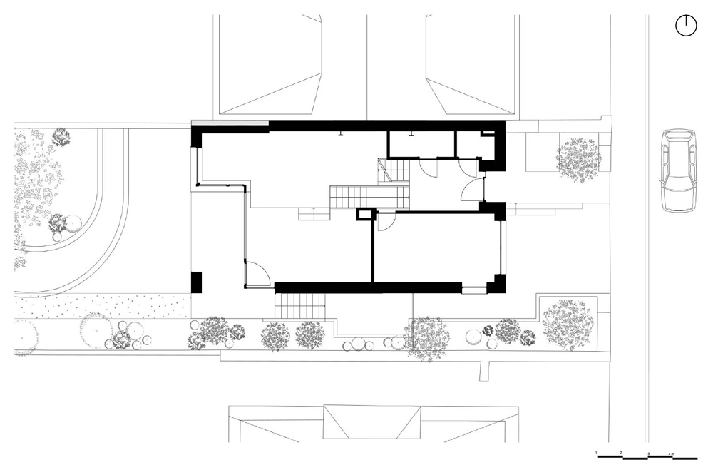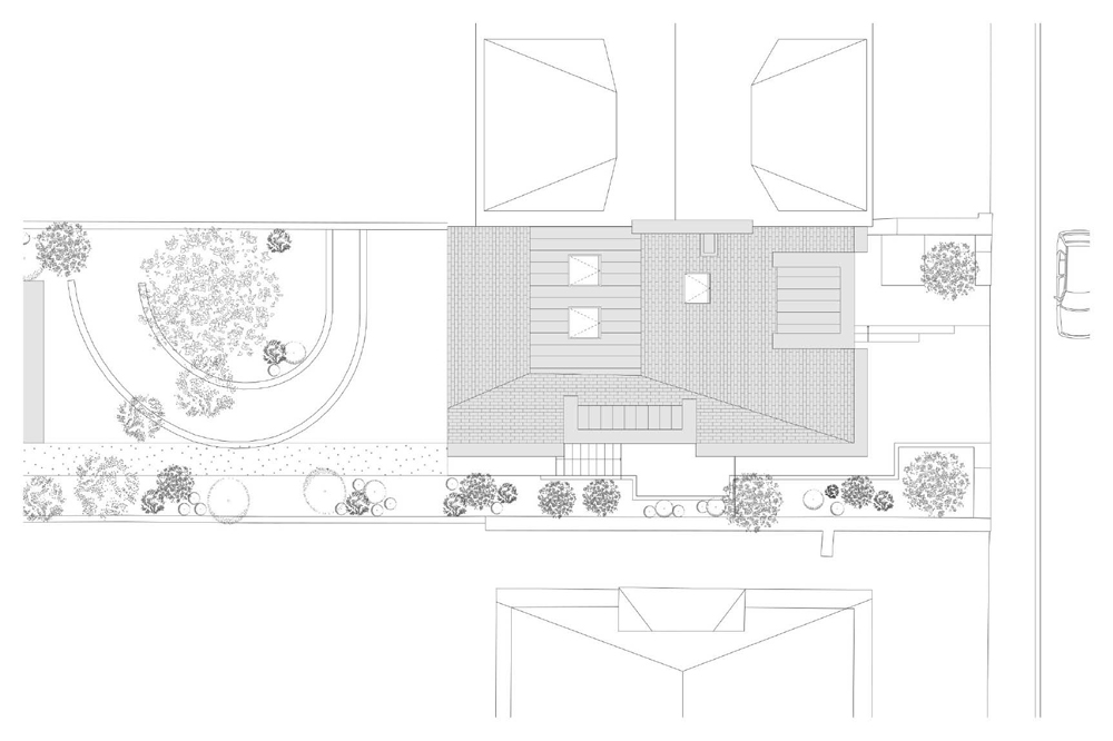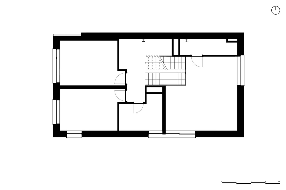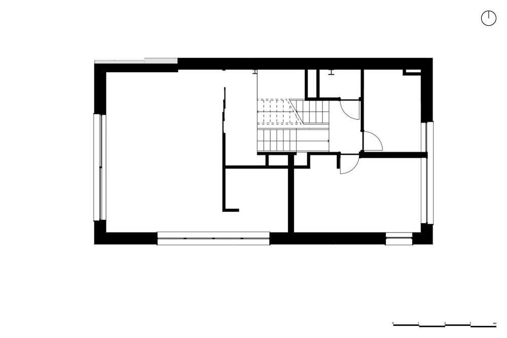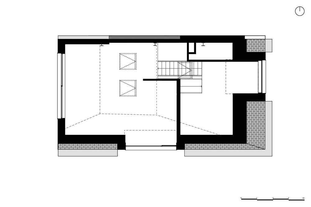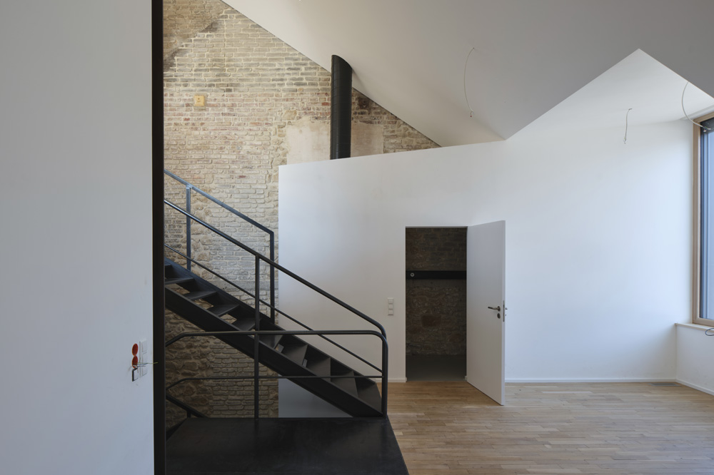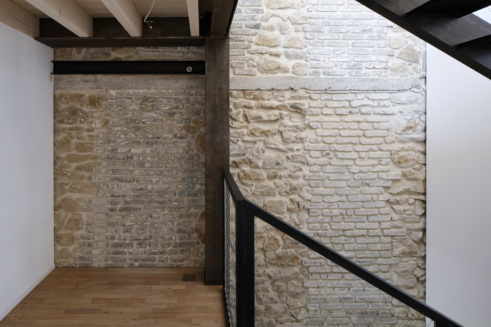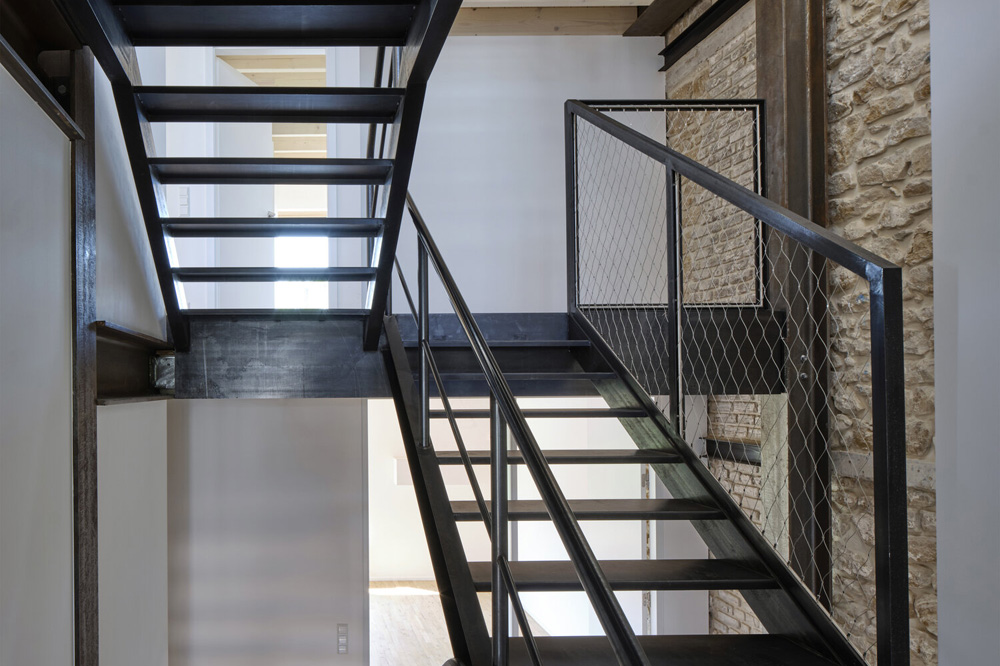 La maison a été construite selon les principes de l’économie circulaire et le respect des ressources énergétiques. C’est une maison construite en bois et en ossature métallique, de manière à être complétement démontable en limitant l’utilisation d’éléments collés peu recyclables. La récupération des matériaux provenant de l’ancienne maison démolie a été poussée dans la limite de ce qui est possible et dans un intérêt économique, il a été décidé de créer le moins de mur possible et d’utiliser les matériaux bruts, par ailleurs des matériaux seconde main ont été acquis sur des plateformes en Belgique. Il en résulte une habitation en liaison directe avec le jardin, entièrement ouverte à l’intérieur, à la circulation libre et offrant des espaces pour chacun. Une maison qui, même si elle est neuve, a déjà une âme, est très chaleureuse, et dans laquelle on se sent immédiatement à l’aise. En contrebas, l’espace s’ouvre sur la cuisine, puis sur un salon encore quelques marches plus bas. Les tuyaux, les poutres métalliques et les boulons sont visibles. Le sol est en béton, le bois est massif. Les chambres offrent l’intimité nécessaire. D’autres espaces permettent encore la rencontre dans les étages.