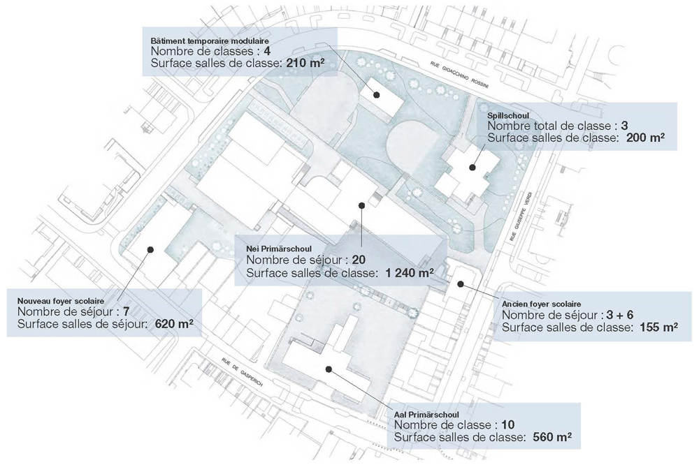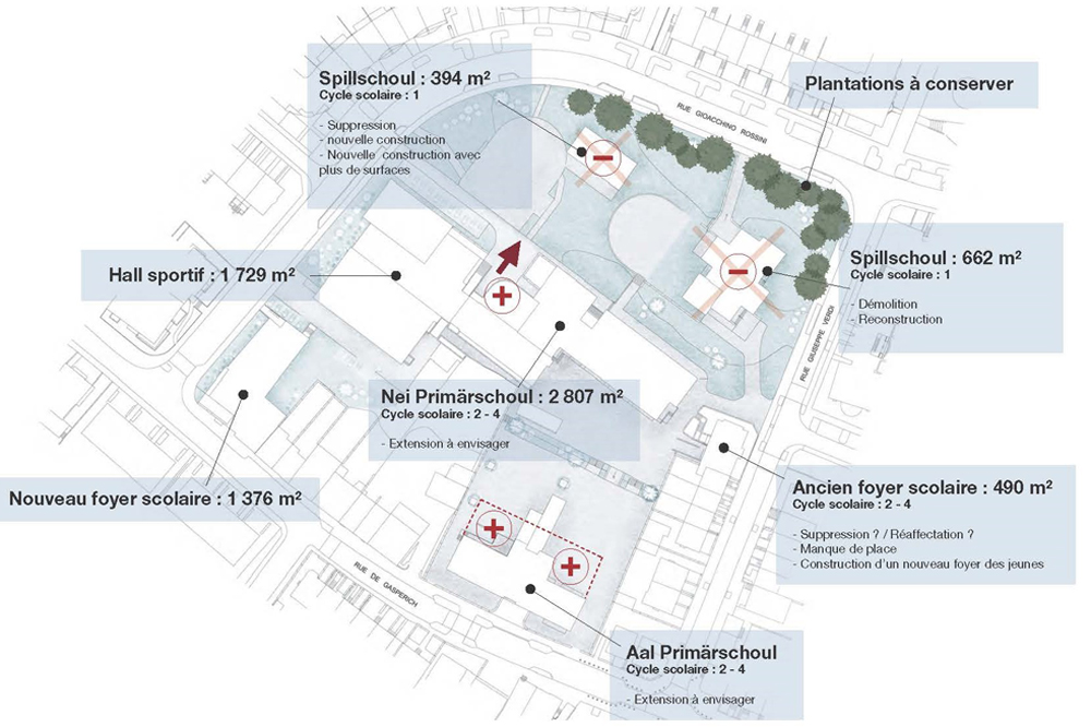 Pour répondre à la croissance de sa population résidente, la Ville de Luxembourg adapte et améliore ses infrastructures scolaires. En cette année 2016/2017, quelque 4817 élèves sont inscrits dans les classes de l’enseignement fondamental de la Ville, dont 425 élèves (9%) pour la seule école de Gasperich.* Outre le nombre croissant d’élèves, les exigences et attentes relatives aux infrastructures scolaires évoluent, par exemple pour refléter l’organisation de l’enseignement fondamental en quatre cycles, mais aussi pour renforcer la coopération entre les écoles et les foyers scolaires au sein de campus cohérents, permettant une prise en charge continue des enfants tout au long de la journée. Depuis quelques années, l’école et le foyer scolaire de Gasperich constituent de facto un campus scolaire, doté d’équipements sportifs et d’espaces de récréation et idéalement situé au cœur du quartier. Cependant, le fonctionnement du site et son développement éventuel sont confrontés à certains défis découlant de l’historique des constructions, mais aussi de la situation foncière, et plus précisément du voisinage avec un tissu bâti complexe, à la fois résidentiel et artisanal. La présente étude, réalisée par Polaris Architects à la demande de la Direction de l’Architecte de la Ville de Luxembourg, a pour objectifs d’analyser la situation existante et de formuler des hypothèses spatiales et volumétriques pour le développement quantitatif et qualitatif du campus scolaire de Gasperich.