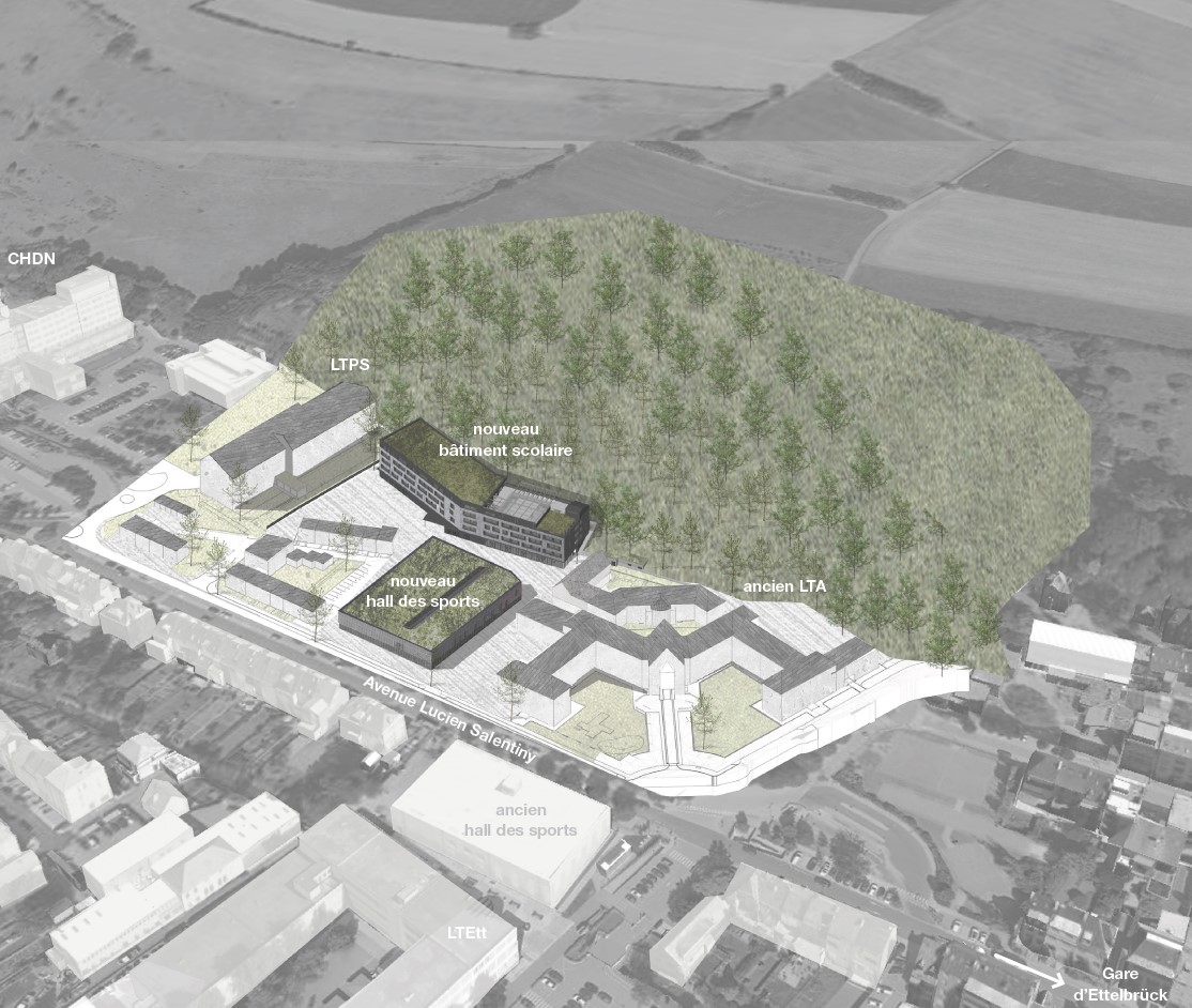 En 2019, le nouveau Lycée technique des professions de santé (LTPS) a ouvert ses portes. La nouvelle situation permet d’envisager des synergies entre les deux lycées et de prévoir des infrastructures communes aux deux : restaurant scolaire, salle polyvalente et hall de sport. Lorsque le Lycée technique agricole (LTA), situé au 72, avenue Salentiny, a quitté ses infrastructures en 2021, une opportunité s’est enfin présentée au LtEtt pour de futures extensions sur le site scolaire à réaménager.