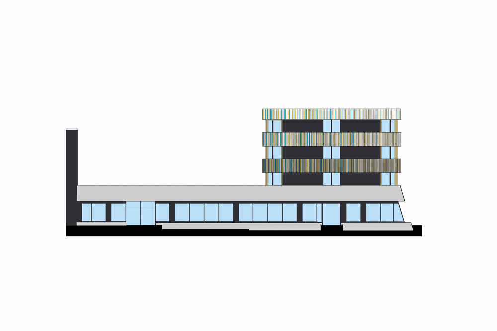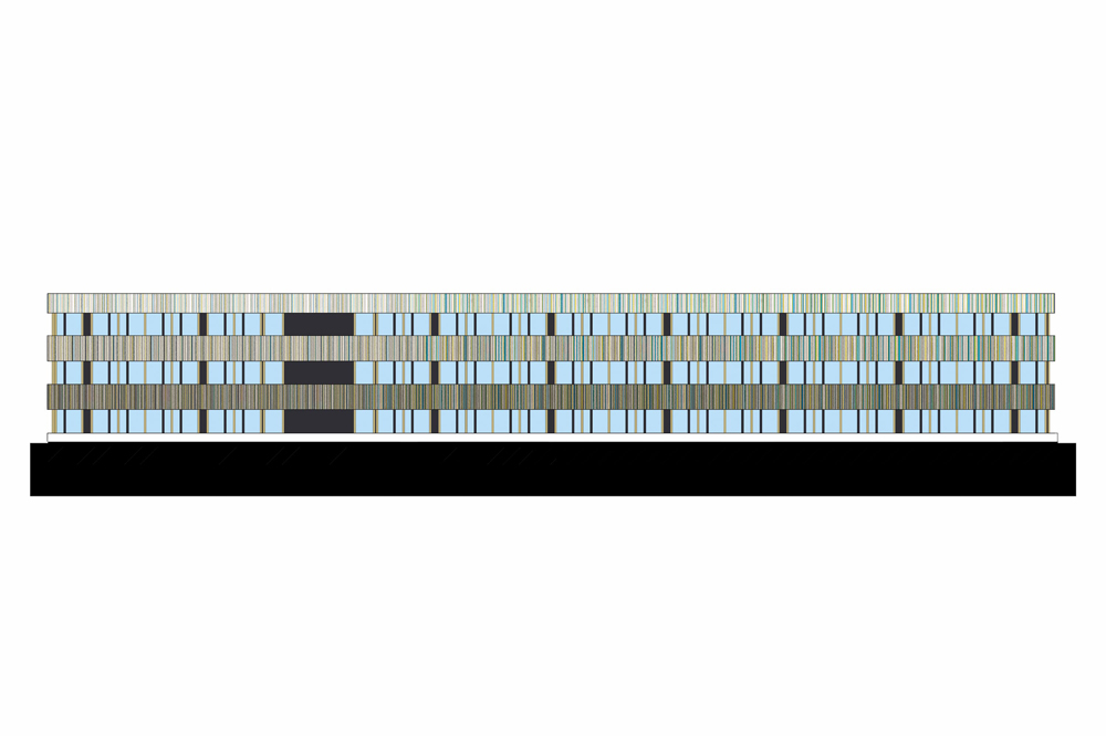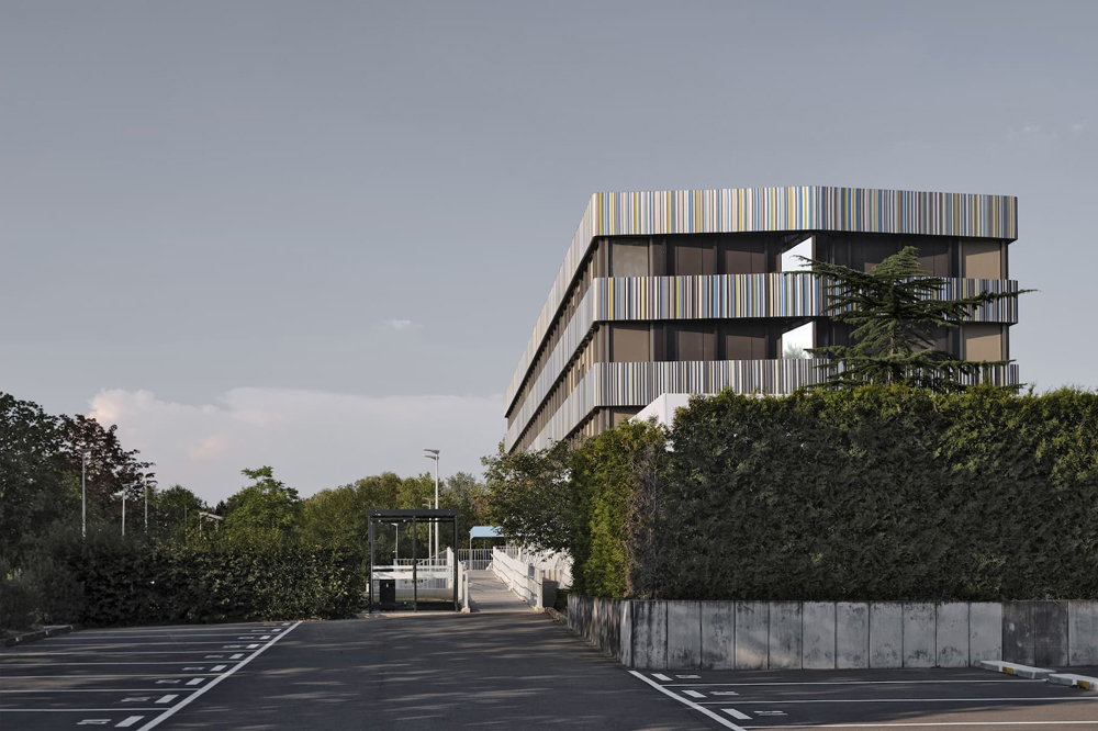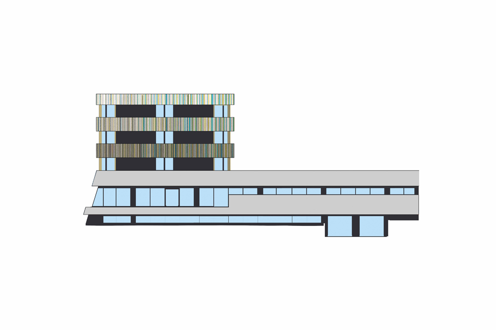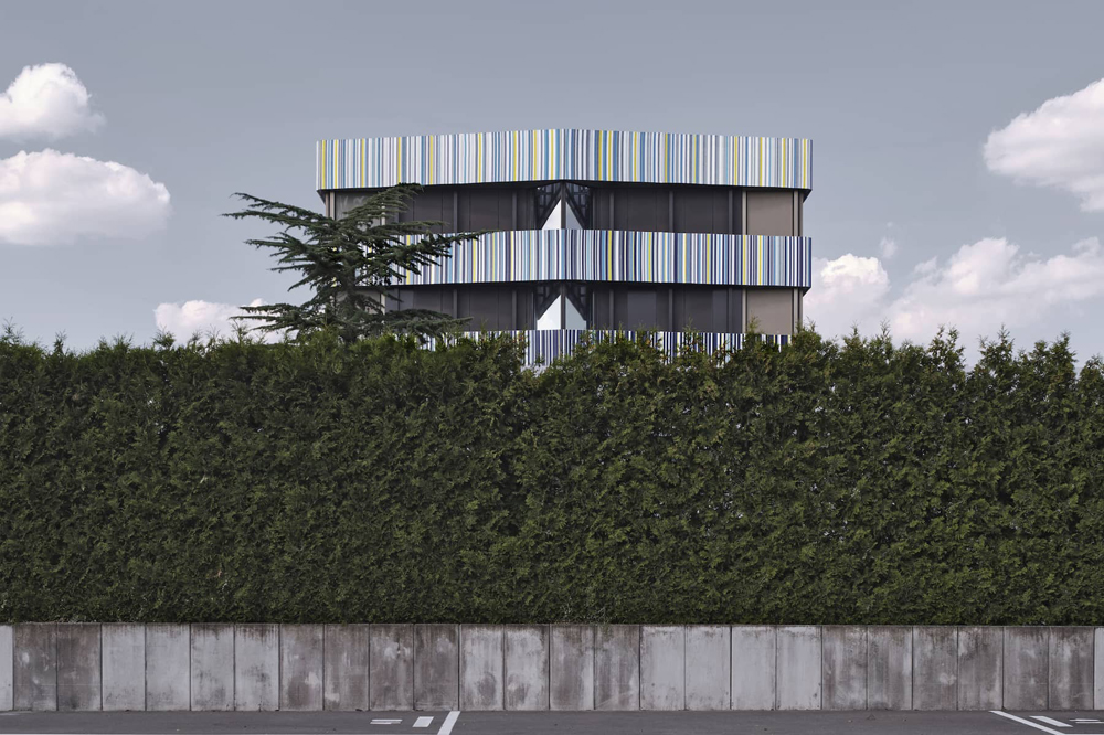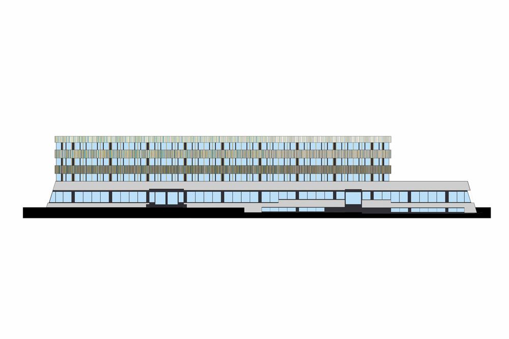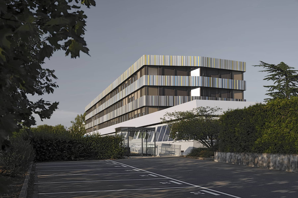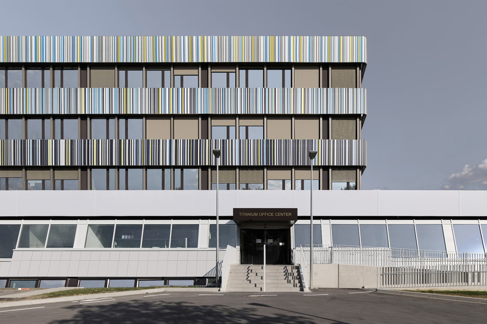 Le projet du Titanium Office Center vise à requalifier le bâtiment principal d’un ensemble immobilier construit dans les années 1990. Il s’agit d’un édifice tertiaire occupé par plusieurs locataires. Le niveau du rez-de-chaussée forme un socle pour les étages supérieurs. Il est composé d’un espace commercial, d’une entrée et d’un hall d’accueil pour les bureaux ainsi que d’un restaurant. Les travaux d’embellissement des façades consistent à mettre en œuvre des toiles tendues dont la sous-structure est fixée sur les façades existantes. Le projet prévoit notamment de mettre en conformité l’accessibilité des lieux aux personnes à mobilité réduite en requalifiant les deux entrées principales de l’édifice. Le projet génère ainsi une nouvelle lecture du bâtiment existant puisqu’il vise à effacer les anciennes lignes verticales de l’édifice au profit de longs bandeaux horizontaux. La singularité oblique du rez-de-chaussée a été adoucie par l’intermédiaire d’un bandeau redressé, mais l’unité du socle est aujourd’hui soulignée par l’emploi de tonalités lumineuses. La verticalité se retrouve à présent dans le graphisme et le dessin subtile des bandeaux supérieurs. Ces multiples lignes colorées dialoguent par effet de contraste avec les couleurs sombres du bâtiment existant en second-plan. Chaque bandeau compose un dégradé du plus foncé au plus clair dont les lignes bleues supérieures se confondent avec le bleu du ciel.
